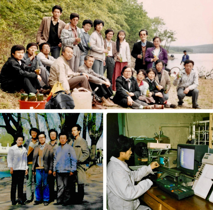 图3 上图:李铁津老师课题组在“净月潭”春游的合影,那时的合照还是“自然派”的,不像现在都被摆成一个姿势。李老师(前排左四),姜月顺老师(前排右三,“前线轨道理论”讲得非常精彩),肖良质老师(前排右五,“中国纳米材料合成第一人”),白玉白老师(后排右二,也是物理背景,作为我硕士的副导师也经常指导我的研究工作),王德军老师(前排右一),刘旺老师(后排右四),我(C位,后排左四,当时流行男生留长发);左下图:与刘旺老师(前排居中)和王德军老师(前排右一)的合影,我在右一;右下图:做硕士论文时的我。