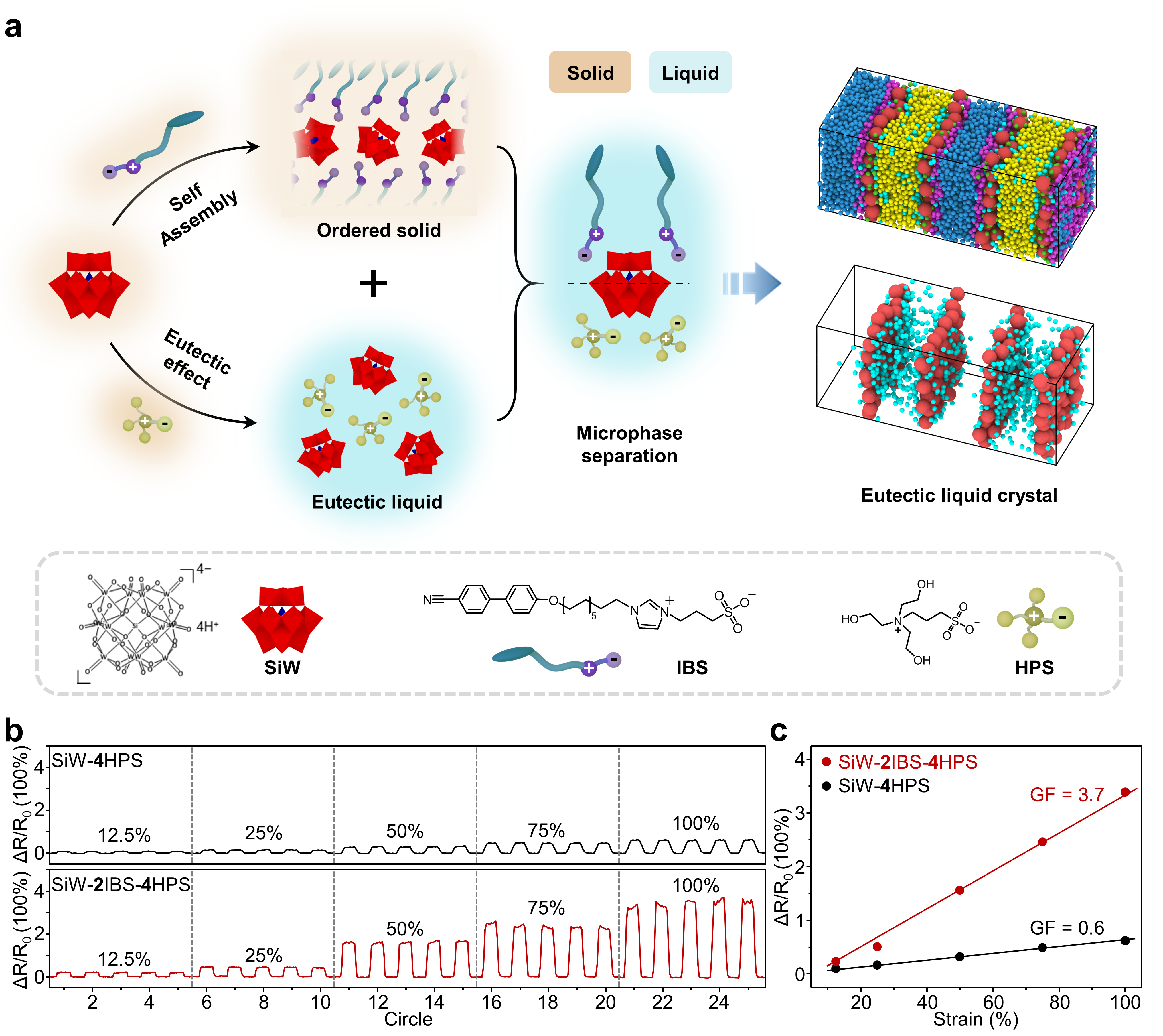 针对上述难题,李昊龙教授团队提出了基于层状液晶结构的响应增强策略。通过调控多金属氧簇(SiW)与共熔导向分子(HPS)及结构导向分子(IBS)间的超分子组装行为及共熔效应,制备了具有有序层状纳米通道的液晶质子导体。研究通过优化体系的静电与氢键作用,实现了质子传导性与形变响应性的协同提升。分子动力学模拟表明IBS/HPS分子在SiW团簇周围发生自组装微相分离,形成了具有交替排列特征的层状超晶格结构,为质子传输提供了高度定向的传导路径。该结构在维持良好质子传导性能(30℃,7.94×10-4S cm-1)的同时,表现出灵敏的形变响应特性。而且,该类液晶质子导体可以与弹性聚合物织物复合制备柔性可拉伸电解质,在100%拉伸应变条件下可实现高达340%的电阻变化率(ΔR/R),其灵敏度系数(GF)达到3.7,较传统均相电解质材料提升超过5倍。