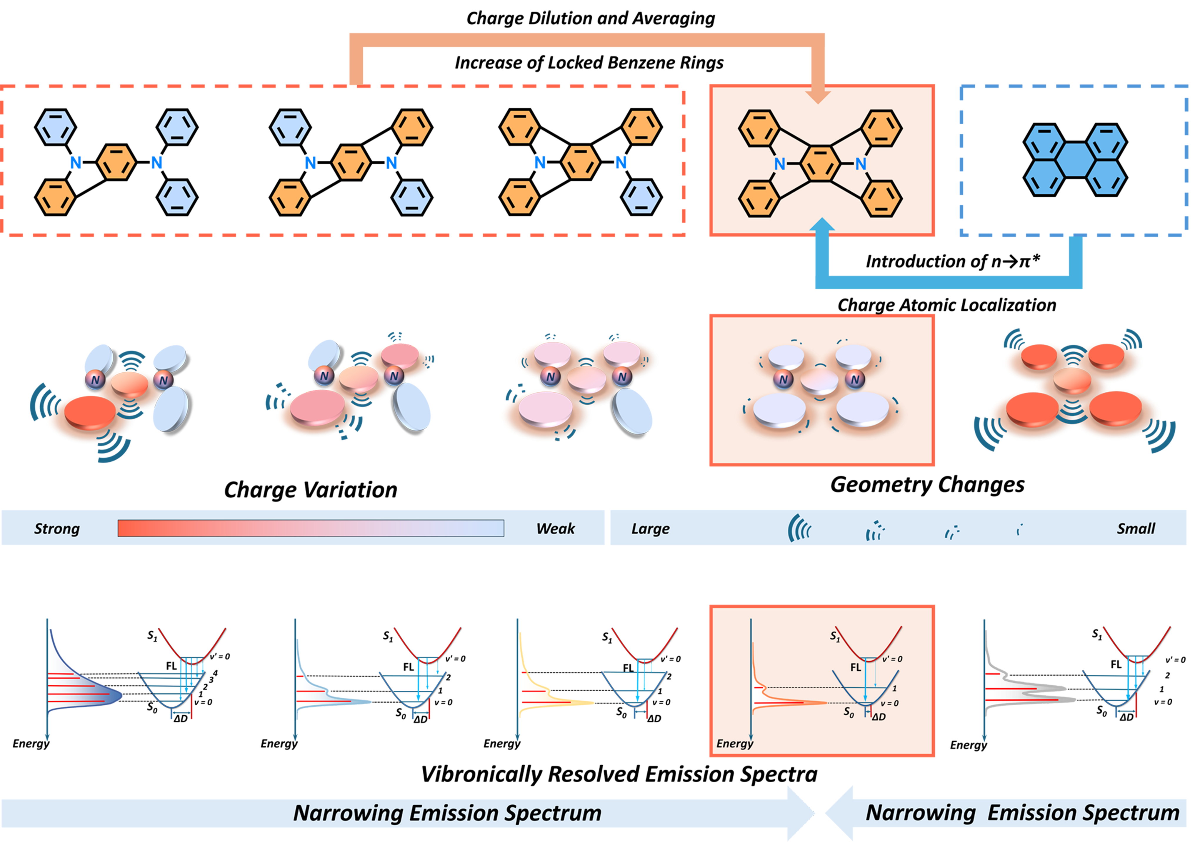 为了满足有机发光二极管(OLED)在未来超高清显示领域的重大需求,有机发光材料必须使其发射光谱具有窄的半峰宽(FWHM),以保证高的色纯度。然而,由于有机共轭体系固有的强电子-振动耦合,有机发光材料通常表现出由于振动劈裂精细结构导致的发射光谱展宽。这意味着超高清显示器件需要额外的滤光或光学微腔处理,不仅造成能量损失,还增加了产品制造成本。虽然多共振(MR)热激活延迟荧光(TADF)材料在该领域取得了很大进展,但其在大规模合成、聚集诱导猝灭及器件效率滚降等方面仍面临相当大的挑战。因此,迫切需要理解发射光谱变窄的潜在机制,并开发不同于经典硼/氮分子体系的新型有机发光材料。