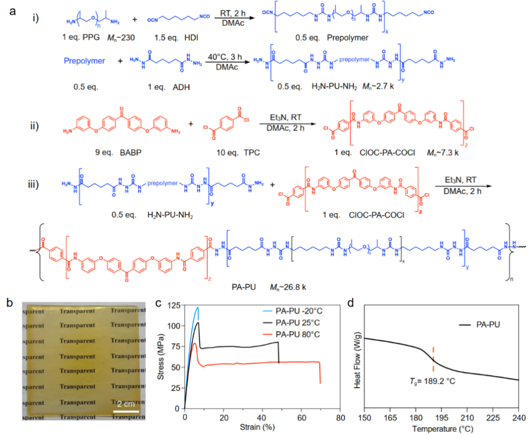 图1. PA-PU的合成、力学性能及热稳定性。(a) PA-PU的合成路线。(b) PA-PU的实物照片(8 cm × 8 cm × 0.18 mm)。(c) PA-PU在不同温度下的应力-应变曲线。(d) PA-PU的DSC测试曲线。