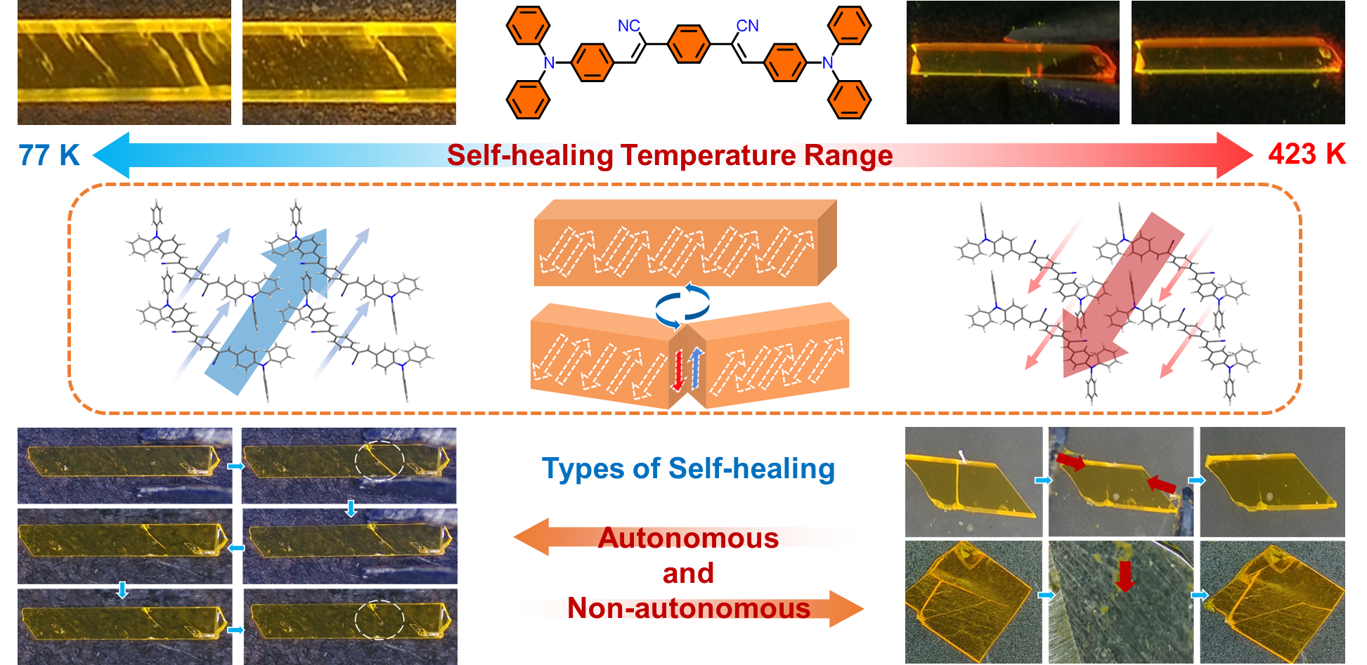 超分子结构与材料全国重点实验室张红雨教授研究组开创性地设计并合成了一种可在–196 ℃至150 ℃极宽温域实现自修复的有机晶体材料,打破了“材料在低温环境中难以自愈”的传统认知。相关成果以“Cryogenically self-healing organic crystals”为题发表在Nature Materials期刊上。