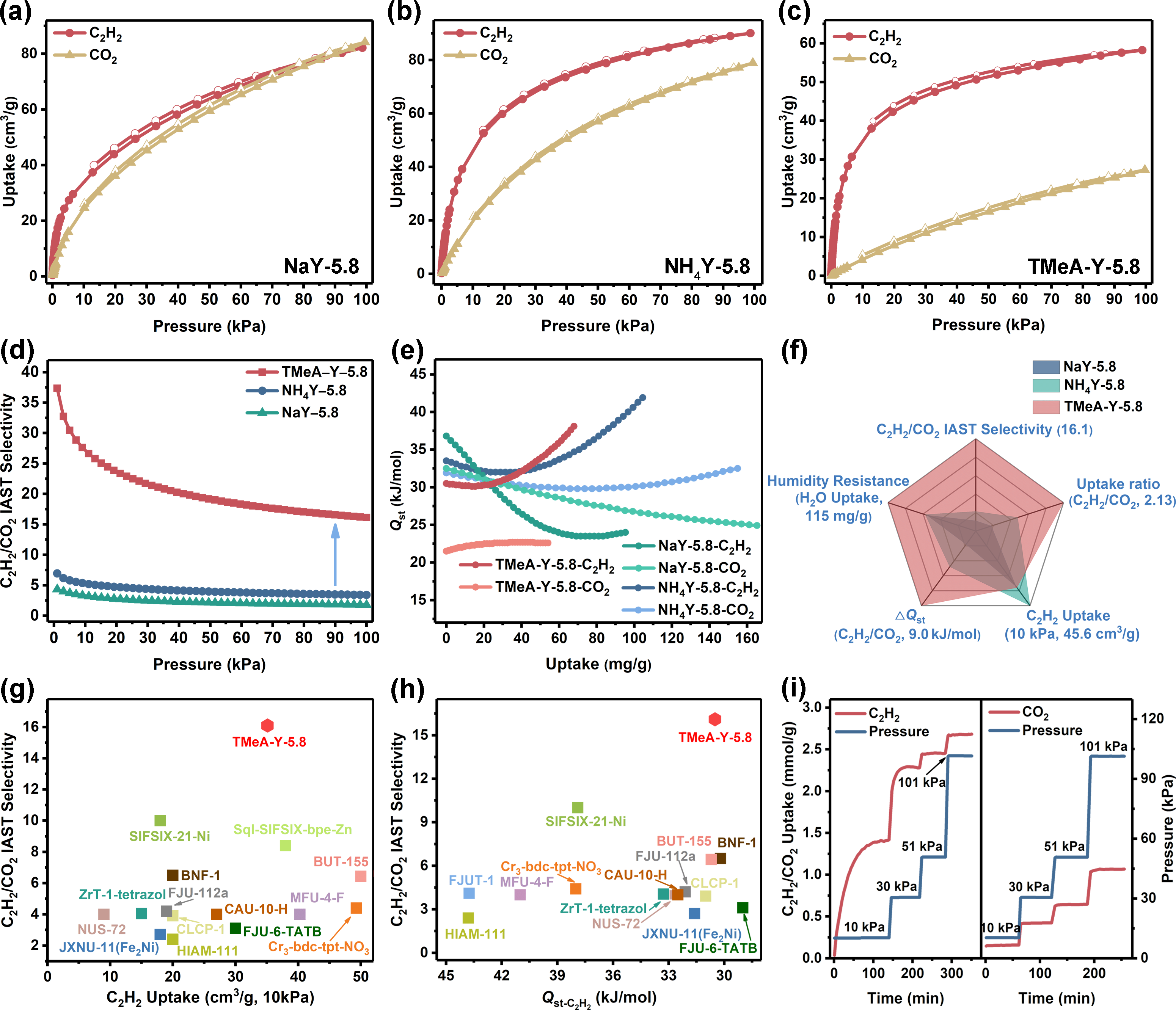 梁志强教授和宋晓伟教授课题组联合天津工业大学梅东海教授,提出通过引入低电荷密度有机阳离子(四甲基铵根离子,TMeA⁺)调控沸石孔道内静电势梯度的新策略,以克服传统弱化学吸附机制的局限,实现高效、低能耗、稳定的C2H2/CO2分离。如图1所示,NaY-5.8和NH4Y-5.8对C2H2和CO2的吸附等温线均为典型的I型,且吸附量接近,表明无选择性。而TMeA-Y-5.8的吸附行为发生根本性转变:C2H2吸附仍为I型,但CO2吸附转变为近乎直线型的准线性等温线。基于吸附等温线,通过理想吸附溶液理论(IAST)预测的C2H2/CO2(50/50)混合气选择性显示,TMeA-Y-5.8的选择性上升至16.1,超过了NaY-5.8(1.79)和NH₄Y-5.8(3.41)。雷达图和性能对比图进一步表明,其综合性能(选择性、吸附量)超过了众多已报道的MOFs、COFs等材料。C2H2和CO2在TMeA-Y-5.8上的吸附动力学曲线表明,虽然CO2初始吸附速率略快,但其平衡吸附量远低于C2H2。这证明分离机制主要源于热力学平衡差异,而非动力学扩散筛分。在基准条件(C2H2/CO2/Ar = 10/5/85)下,TMeA-Y-5.8的C2H2穿透时间长达40.85 min/g,而CO₂几乎紧随载气Ar穿透(3.54 min/g),形成了宽阔的分离平台(如图2所示)。其动态分离因子高达13.1,与静态IAST预测值(16.1)吻合,显著优于NaY-5.8(3.27)和NH₄Y-5.8(4.45)。除此之外,TMeA-Y-5.8具备优异的操作弹性、低能耗再生能力和抗杂质干扰能力。从DFT计算,差分电荷密度分析以及相对介电常数等多角度进一步验证了静电势梯度调控机制。本研究证实通过调节沸石孔道内静电势梯度可实现对相似物理性质气体的高效识别与分离,为今后设计高性能沸石吸附剂提供了新的理论思路和材料平台。