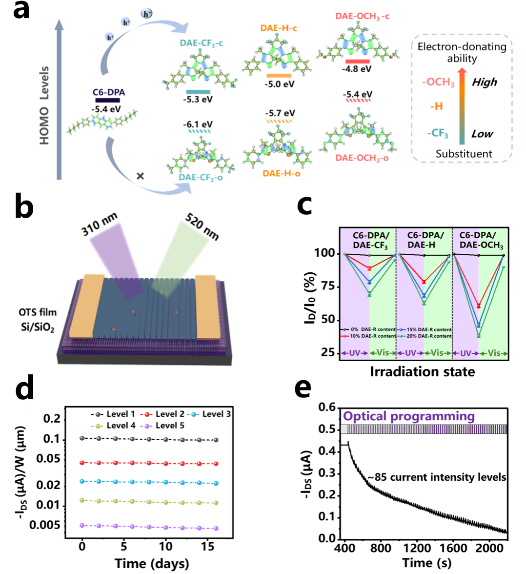 刘朝阳教授团队联合法国斯特拉斯堡大学Paolo Samorì教授团队提出了一种基于“分子工程”的主客体设计策略:将光开关型二芳基乙烯(DAE)分子作为功能性“客体”,均匀分散到由2,6-双(4-己基苯基)蒽(C6-DPA)构成的二维有机分子晶体“主体”矩阵中,成功构建出沟道电流可被光场编程的场效应晶体管。在紫外光照射下,DAE分子发生光致异构化反应,由开环态转变为关环态,其能级随之发生偏移,在C6-DPA晶体矩阵中从电荷传输路径上的中性组分转变为捕获自由电荷的“陷阱”,从而显著抑制沟道电流。而在可见光照射下,DAE分子可逆地恢复为开环态,不再捕获自由电荷,器件电流回到初始水平。整个过程高度可逆且无损于晶体结构。进一步地,通过在DAE分子边缘修饰不同给/吸电子能力的取代基,实现了对其能级的定制化调控,从而系统地揭示了DAE分子结构与C6-DPA电荷输运调控效能之间的构效关系。实验发现,经强给电子基团(-OCH3)修饰的DAE-OCH₃分子与C6-DPA主体之间形成了最大的能级差(0.6 eV),可构成自由电荷的“深陷阱”,仅需5秒紫外光“写入”,器件电流即可实现高达54%的可逆调制,这一效率显著优于传统的非晶共混体系。作为对比,未修饰基团(-H)的DAE分子与主体能级差为0.4 eV,电流调控幅度约为31%;而引入强吸电子基团(-CF3)的DAE分子与主体能级差仅为0.1 eV, 所形成的“陷阱”极浅,调控幅度降至21%。值得注意的是,能级优化后的C6-DPA/DAE-OCH₃主客体体系展现出强大的多级信息存储能力:单个存储单元可稳定区分85个电流状态,对应超过6比特的存储容量,且数据保持特性优异,16天后电流态仍高度稳定。