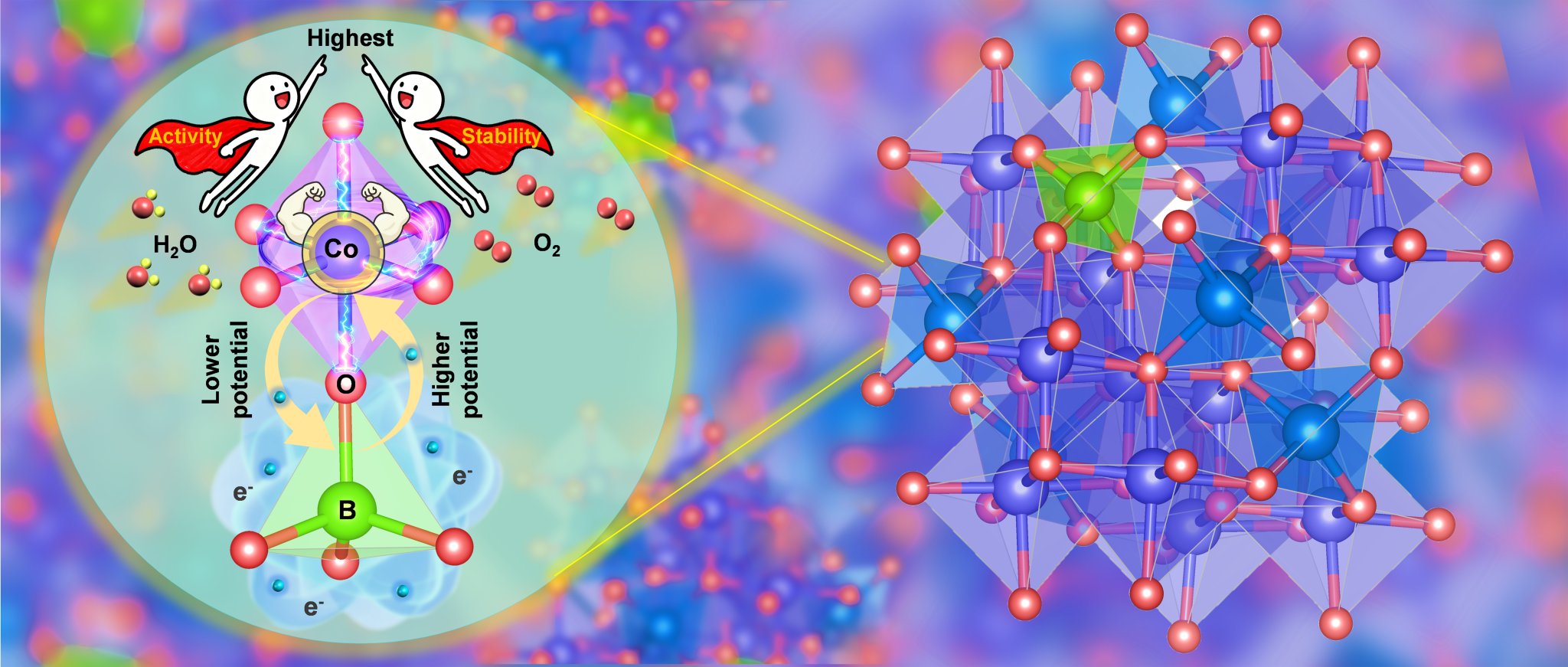 黄科科教授团队设计了一种新型催化剂,他们巧妙地将“类金属”硼原子选择性地占据Co3O4中的四面体钴位点。这不仅在合成方面实现了一项重要突破,更关键的是,由此精准构筑的[BO4]结构单元促进了电子向八面体活性位点离域,赋予了催化剂一种独特的“自适应调控”能力。具体而言,该研究以具有强碱性和强氧化性的水氧化反应为催化模型,结合一系列原位表征技术,研究发现:在较低的氧化电位下,[BO4]单元能够对该外部刺激作出积极响应,推动活性八面体钴位点向有利的活化状态转变,从而显著提升本征活性。而当电位升高时,[BO4]单元则展现出另一种调控方式,反向调节电子流向,有效抑制活性位点的过度氧化,进而增强催化剂的耐久性。这项工作揭示了通过精准结构调控实现自适应电子转移的内在机制,为高性能催化体系的设计提供了全新思路。